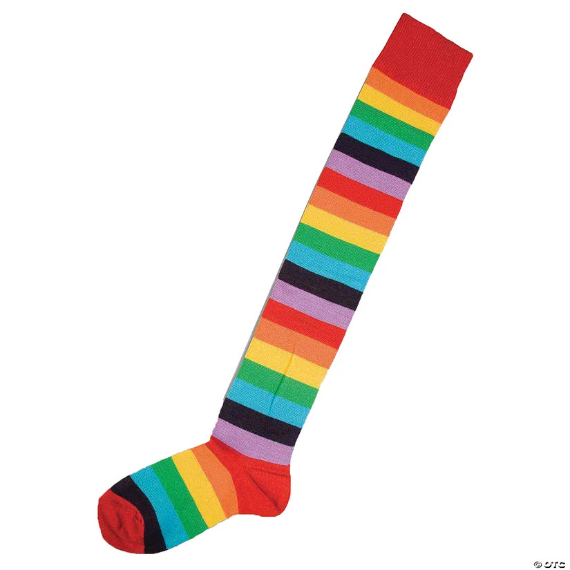 Multi- Colored Rainbow Adult Clown Socks. Perfect for Clowns, Geeks, Nerds and Cool people too! Includes: One pair of multi-colored striped clown socks. 100% Polyester. Available Sizes: One size fits most adults and teens.Special Shipping Information: This item ships separately from other items in your order. This item cannot ship to a P.O. Box. This item may be subject to additional processing days.ITEM IS NOT ELIGIBLE FOR EXPEDITED SHIPPING