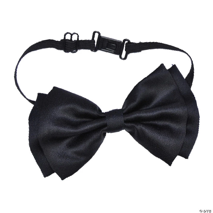 Perfect for a Bunny, Geeks, Nerds, Gangster, Spy, or to complete your tux. Satin bow tie with black elastic adjustable band which has a push in snap closure. Available color: Black Other Colors available: Rainbow/Red/Pink and Black Checkered/Black and White Checkered.Special Shipping Information: This item ships separately from other items in your order. This item cannot ship to a P.O. Box. This item may be subject to additional processing days.ITEM IS NOT ELIGIBLE FOR EXPEDITED SHIPPING