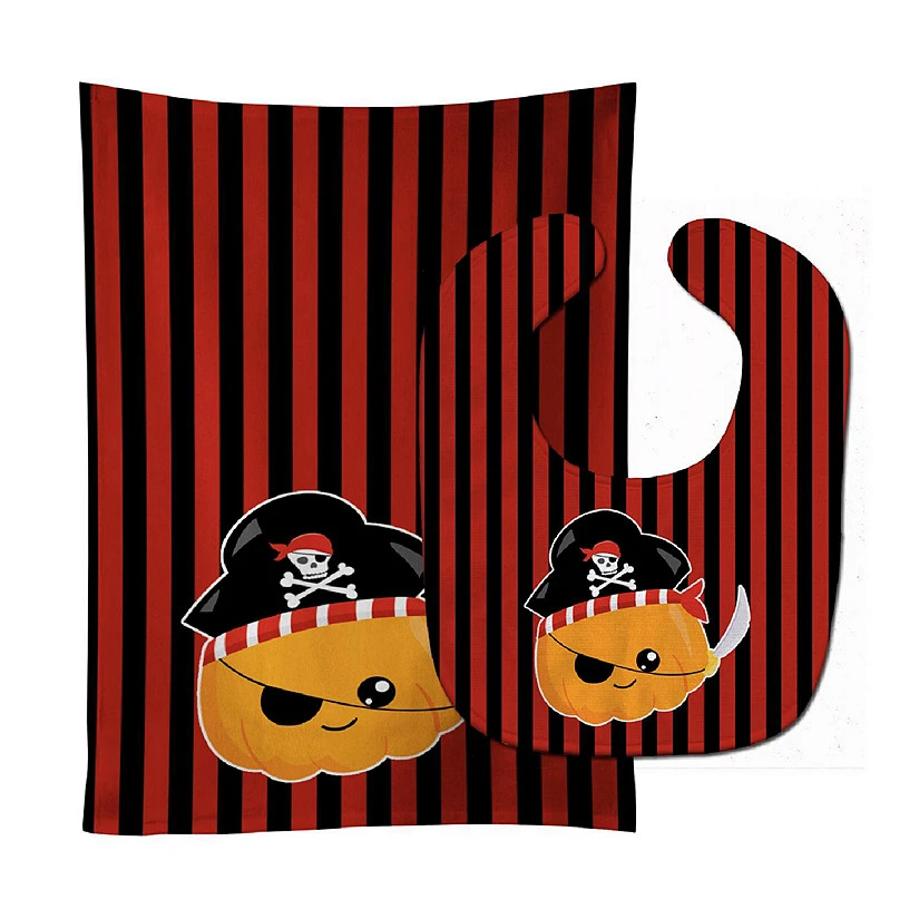 Halloween Pumpkin Pirate Baby Bib & Burp Cloth. Celebrate Halloween with this Halloween Bib & Burp Cloth. Baby Bib and Burp Cloth Set that is both Cute and Functional. Dyed plush fabric baby bib with Velcro closure. Made of ultra-smooth micro-mink polyester that reverses to 100% cotton terry loops. Measures 10 inches x 13 inches, 0.8 oz. per piece. Edges are finished with binding. Plus a Dyed plush fabric baby burp cloth. Made of ultra-smooth micro-mink polyester that reverses to 100% cotton terry loops. Measures 11 inches x 18 inches, 0.8 oz. per piece. Edges are finished with binding. Machine washable and dry on low heat. Fade resistant and stain resistant. Top fabric gets even softer after the first wash.