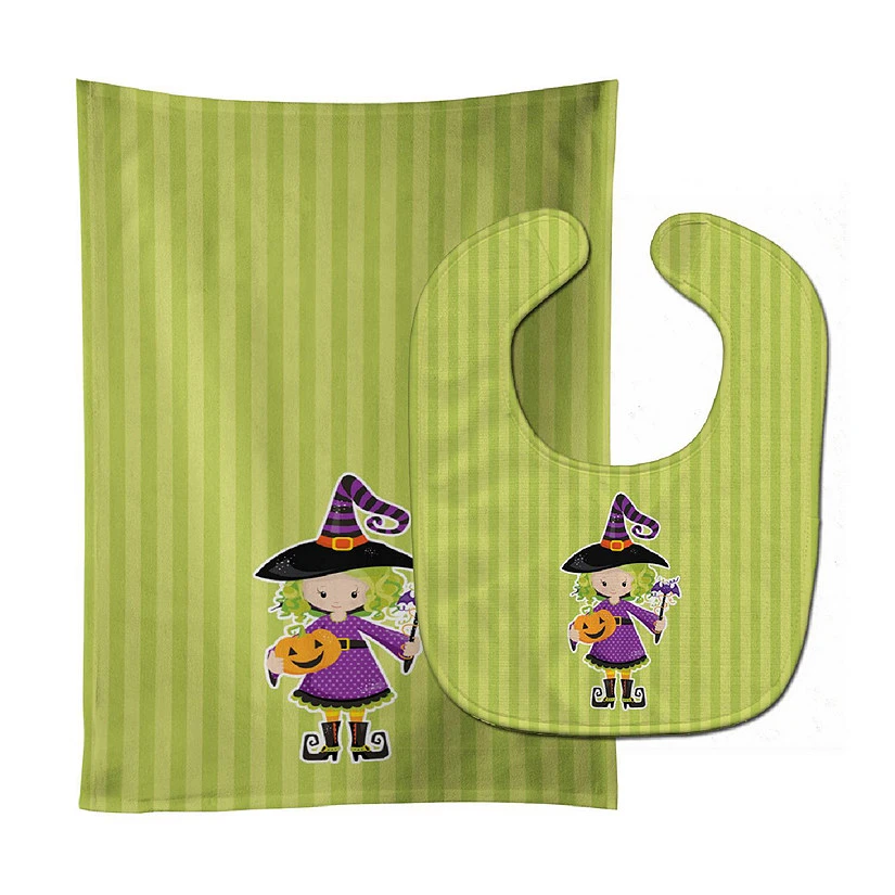 Halloween Witch #2 Baby Bib & Burp Cloth. Celebrate Halloween with this Halloween Bib & Burp Cloth. Baby Bib and Burp Cloth Set that is both Cute and Functional. Dyed plush fabric baby bib with Velcro closure. Made of ultra-smooth micro-mink polyester that reverses to 100% cotton terry loops. Measures 10 inches x 13 inches, 0.8 oz. per piece. Edges are finished with binding. Plus a Dyed plush fabric baby burp cloth. Made of ultra-smooth micro-mink polyester that reverses to 100% cotton terry loops. Measures 11 inches x 18 inches, 0.8 oz. per piece. Edges are finished with binding. Machine washable and dry on low heat. Fade resistant and stain resistant. Top fabric gets even softer after the first wash.