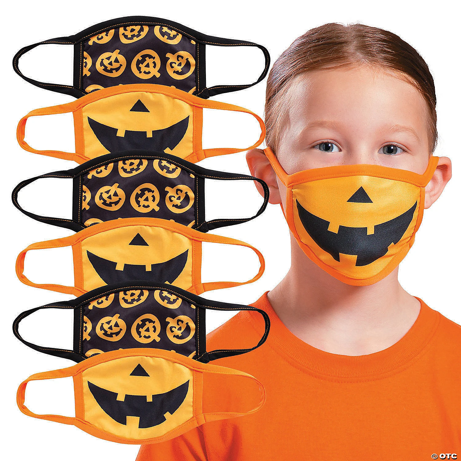 Crack a grin with these smiling jack-o’-lantern face masks! Made specifically for kids’ faces, these too-cute-to-spook coverings will really get them in the Halloween spirit. Little boos and ghouls will love sporting these masks while trick-or-treating, hitting up the pumpkin patch or just heading around town. These mask packs include three each of two different designs, so each day you can choose which style meets your mood! Polyester and cotton. (6 pcs. per unit) 5 1/2″ x 4 1/4″ with 2 1/2″ ear loops. Imported. © OTC