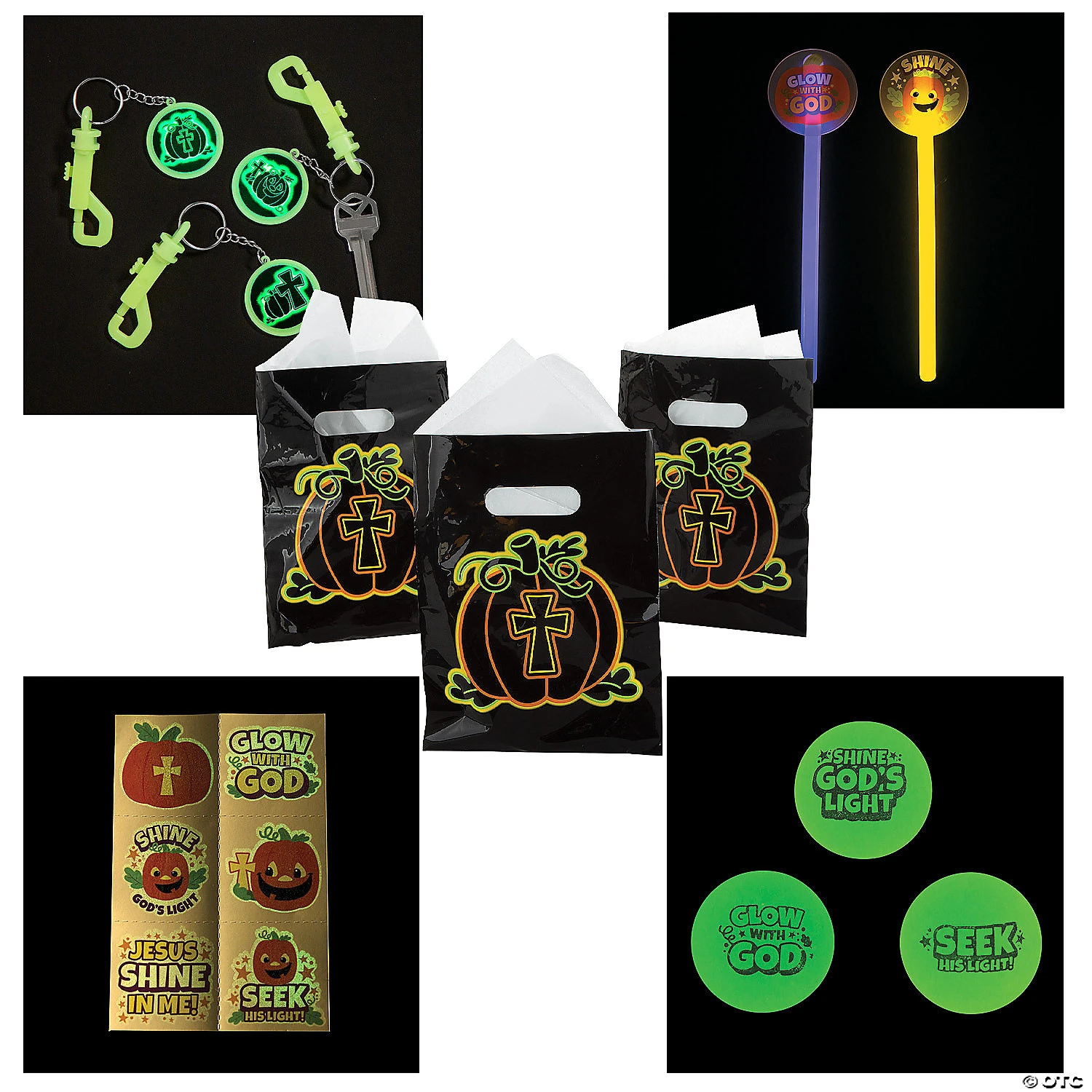 Get ready for some glow-rious fun for His glory! This handout kit makes it easy to put together up to four dozen Christian Pumpkin themed goody bags to hand out at Sunday School, at a Harvest Festival or as Halloween party favors for young believers. Take the stress out of religious Halloween celebration planning with this helpful handout kit. (338 pcs. per unit) Assortment may vary. Simple assembly required.Includes:• 48 Christian Pumpkin Glow Bracelets with Card (Includes twelve 8″ glow sticks, twelve 1″ plastic connectors and twelve 4″ x 51/2″ paper cards with To/From space. Simple assembly required.)• 48 Plastic Christian Pumpkin Glow Wands (8 1/4″ Simple snap and shake to activate the glow.)• 50 Plastic Neon Christian Pumpkin Goody Bags (7″ x 9 1/2″)• 48 Plastic Glow-in-the-Dark Christian Pumpkin Backpack Clip Keychains (1 1/2″ on a 2″ clip and a 1″ metal ring. Expose items to direct daylight to activate the glow.)• 144 Glow-in-the-Dark Christian Pumpkin Temporary Tattoos (1 1/2″ Easy to apply and remove. Safe and non-toxic.)• Assortments are subject to change at any time and may vary from picture shown. Substituted items will be similar in nature.