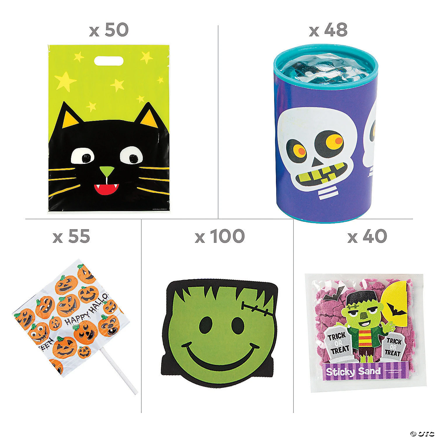 Delight trick-or-treaters or all the young boos and ghouls in your life with a fun Ghoul Gang goody bag! This helpful kit makes it easy to put together up to four dozen fun Halloween handout bags featuring the not-so-creepy Ghoul Gang characters. Treats, toys and bags are all included in this Halloween handout kit. (202 pcs. per unit) Simple assembly required. Assortment may vary. Includes:• 55 Halloween Print Suckers (Each 1 1/4″ pop comes on a 3″ papier-mâché stick. Fruit flavors. Total wt., 1 lb. Candy is non-returnable. For more information, visit our “Return Policy” page located on our website. Made in the USA, Important Country of Origin Information: For certain items sold by Fun Express on our Web or Mobile sites, country of origin information can change and what is displayed may not be accurate or consistent with manufacturer information. For up to date country of origin information, it is recommended that you rely on product packaging or other manufacturer information. Ingredient, nutrition, allergen and other product information are provided on our Web and Mobile sites for reference purpose only, without warranty or representation as to accuracy. Manufacturers adjust their labeling regularly and are solely responsible for the accuracy of the information. For general questions concerning these items, please contact our customer service at 800-228-0475.)• 50 Plastic Ghoul Gang Goody Bags (12″ x 17″)• 48 Ghoul Gang Sticky Sand Packets (Each plastic packet contains 13 grams of sand. 3″ x 4″)• 48 Plastic Mini Halloween Character Prisms (1 3/4″)• 1 Smile Face Monster Sticker Roll (100 stickers per roll, shrink-wrapped. 1 1/2″)• Assortments are subject to change at any time and may vary from picture shown. Substituted items will be similar in nature.