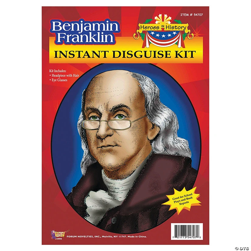 Bring the ultimate polymath to life with the Heroes in History: Benjamin Franklin costume kit! An excellent idea for kids Halloween costumes or for adult Halloween costume accessories. Each kit includes a headpiece with hair and eyeglasses styled like Ben Franklin. Use to liven up school projects and assignments, or for community plays. Special Shipping Information: This item ships separately from other items in your order. Imported.