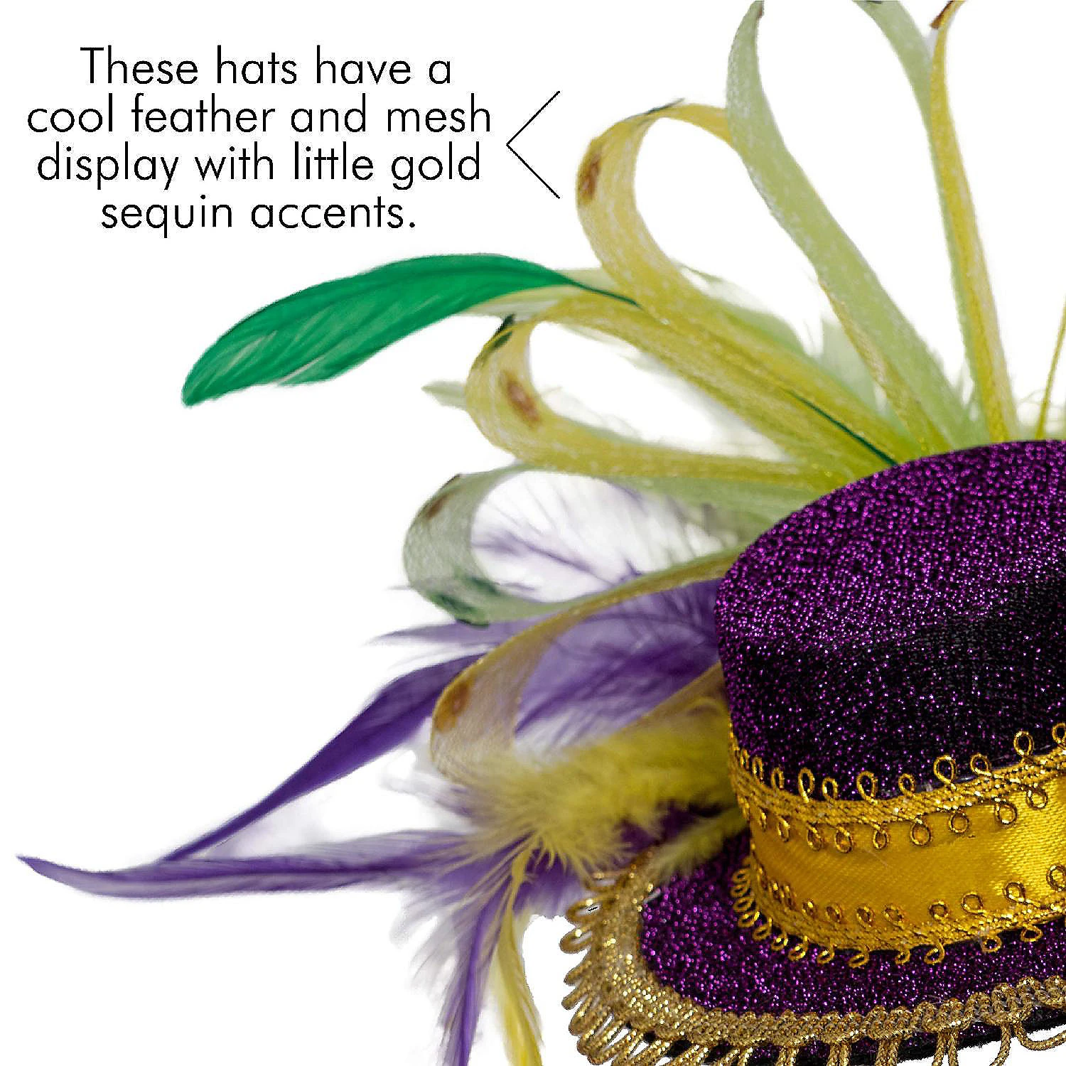 The hats are 5″ long and have a cool feather and mesh display with little gold sequin accents.
