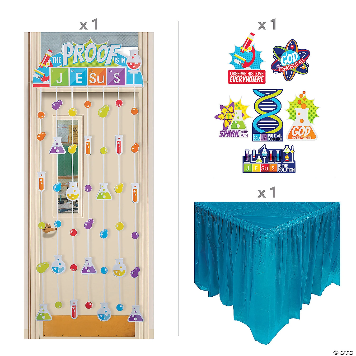 Your trunk or treat station is sure to get big reactions from passersby with the help of these decorations! Featuring a religious science theme complete with messages of God’s love, these Halloween decorations are ideal for school, community or church trunk or treat events. (8 pcs. per unit)Includes:• 6 Cardstock Science VBS Cutouts (12″ – 20 1/2″ x 11 1/4″ – 20 1/2″)• 1 Cardstock Science VBS Door Curtain with Border (3 ft. x 7 ft. Simple assembly required.)• 1 Plastic Turquoise Pleated Table Skirt (14 ft. x 29″ Tablecloth sold separately.)• Assortments are subject to change at any time and may vary from picture shown. Substituted items will be similar in nature.