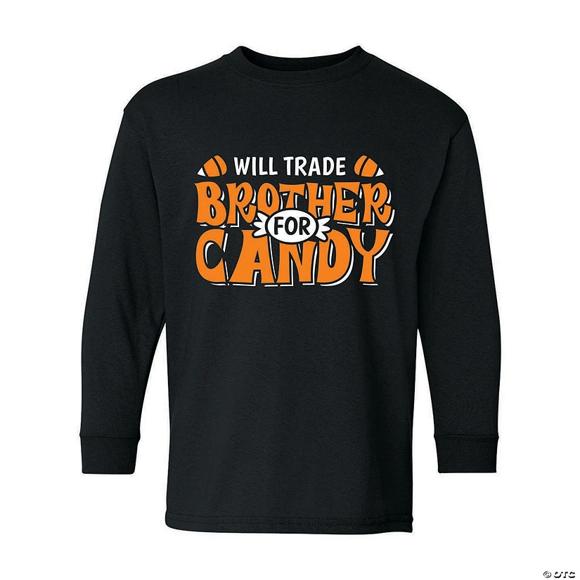 When candy is the goal, you’ll do just about anything to reach it! This funny Halloween t-shirt is great for boys and girls who have a sweet tooth that just won’t quit. Don this graphic tee for Halloween parties, pumpkin patch visits or everyday fall apparel. © OTC• Brand: Gildan.• Long sleeve• Preshrunk 100% polyester with cotton feel, 5.3 oz.• Seamless three-quarter collar• Taped neck and shoulders• Tear away label• Double-needle collar, sleeve and bottom hems• Rib cuffs• CPSIA tracking label compliant• Need more? With our tees, we’ve got your back (and front)! To order in bulk for any size group, just call 1-877-513-0384. Or, give us a ring if you’d like to easily customize any of our pre-printed shirts with our free design service.